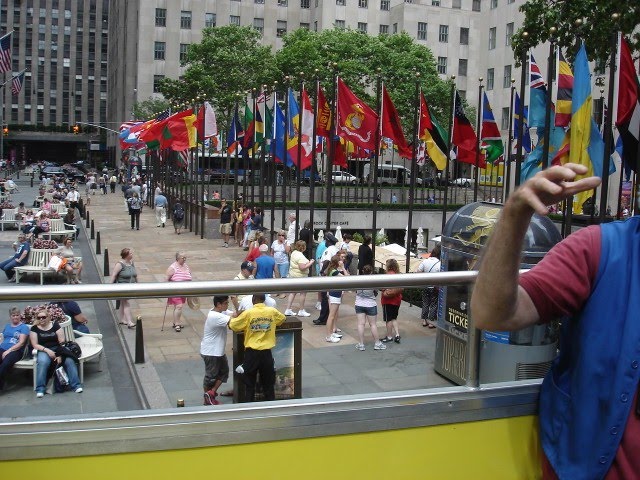 Our thanks to Liz Kemper for getting information and our tickets for a city tour of Manhattan aboard a double decker open air bus. On Sunday we walked nearby to the Path train station, after Tom found the correct language for purchasing a ticket (inside joke) we were off for Manhattan. For a Sunday, I was amazed to find the train packed to the brim. After a short ride we walked down Broadway and climbed aboard the tour bus “City Sites of NY”. The on and off boarding option, narrated tour, took us by 23 stops such as the Empire State Bldg, World Trade Center Site, Wall Street, Battery Park, United Nations, Times Square, Greenwich Village and etc. We walked at the World Trade Center Site and the St Paul’s Chapel which was instrumental in helping victims of the attack. The church has preserved all the mementos, pictures and stuffed animals from family and friends.